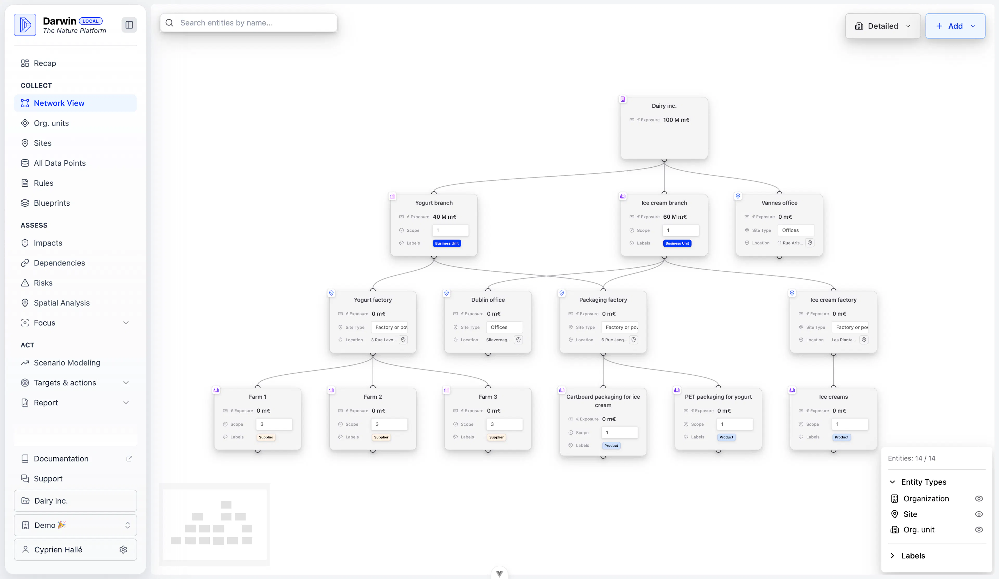 Entities represent your organizational structure in Darwin. They form a hierarchy that allows you to allocate environmental data and track impacts across your organization.